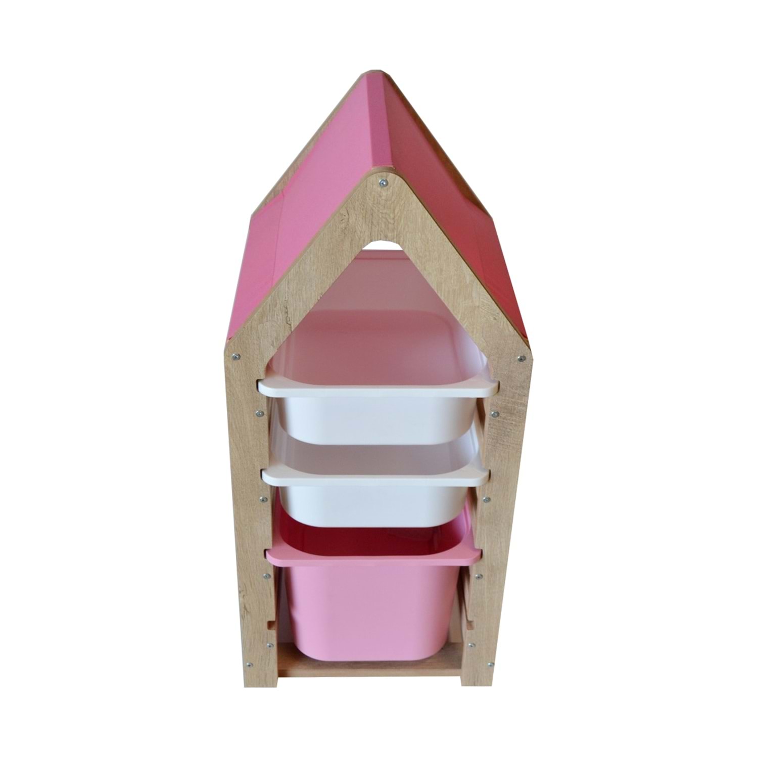 Montessori Pembe Oyuncak Saklama Düzenleme Ünitesi Dolabı - 1 Büyük Pembe 2 Beyaz Trofast Sepetli